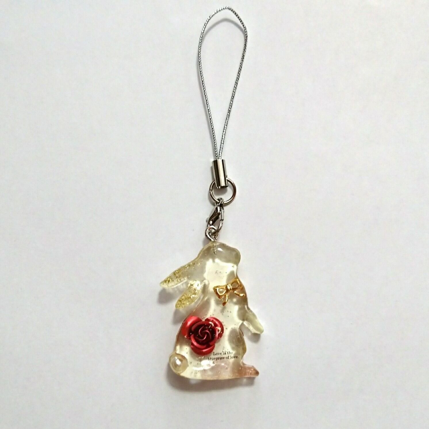 薔薇型パーツ等をレジンで閉じ込めた、うさぎのチャームです。