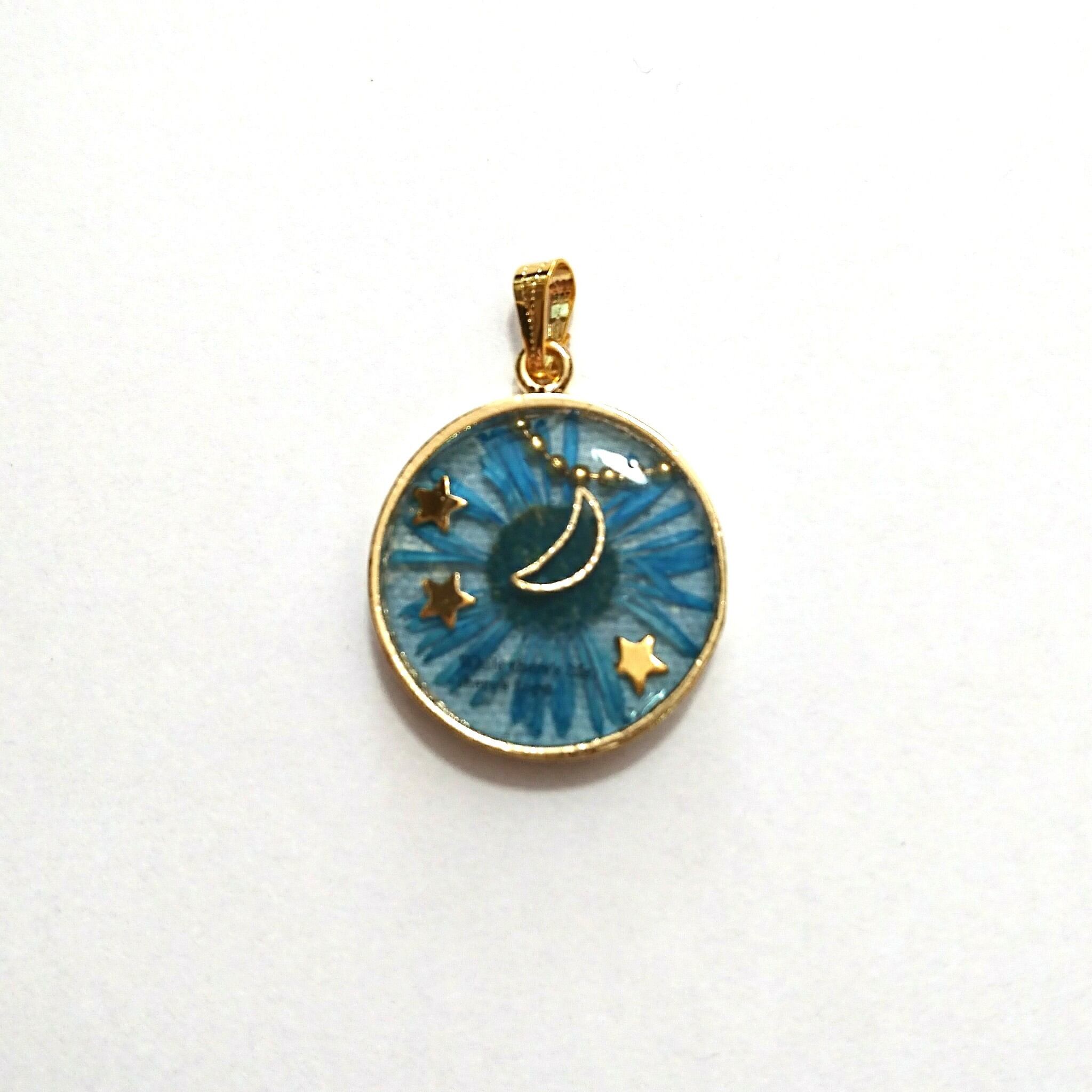 ブルーのお花と、月や星のチャームを閉じ込めた、円のネックレストップです。